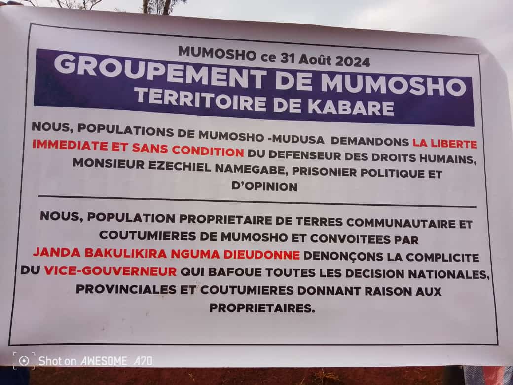 Ezechiel Namebabe, défenseur des droits humains du Territoire de Kabare dans le groupement de Mumosho, est actuellement incarcéré à la prison centrale de Bukavu. Il a été emprisonné après avoir dénoncé une spoliation de plus de 200 hectares de terres à Mumosho.