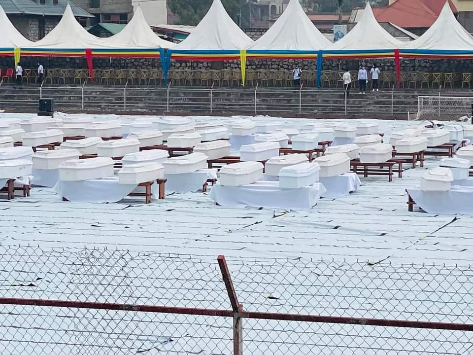 La cérémonie d’inhumation au stade de l’unité à Goma est suivie d’un moment de recueillement, où les familles ont pu se recueillir autour des tombes fraîchement creusées. Des fleurs ont été déposées, des prières murmurées, des larmes versées. Un silence pesant a suivi, comme si la terre elle-même pleurait les victimes.