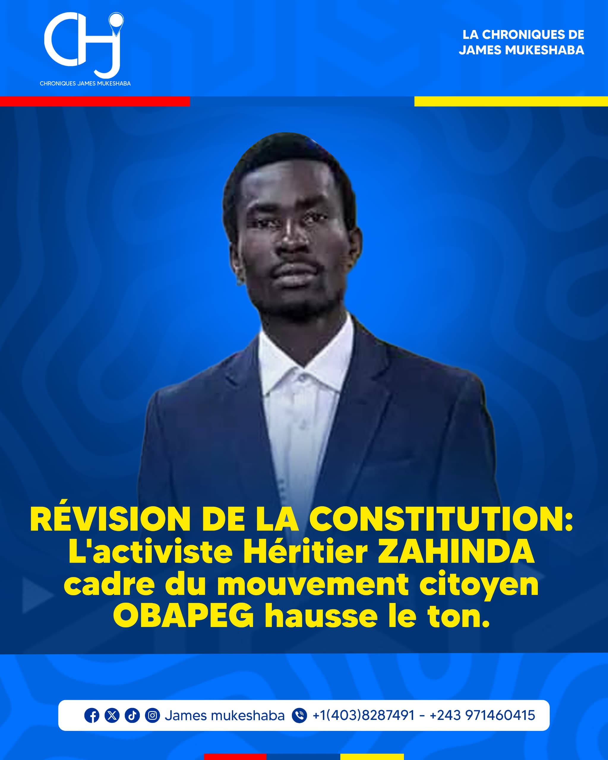 Le militant du Mouvement citoyen OBAPG RDC, Héritier Zahinda, appelle la population de la RDC et celle du Sud-Kivu, à s’opposer fermement à toute tentative du régime en place de modifier la constitution.