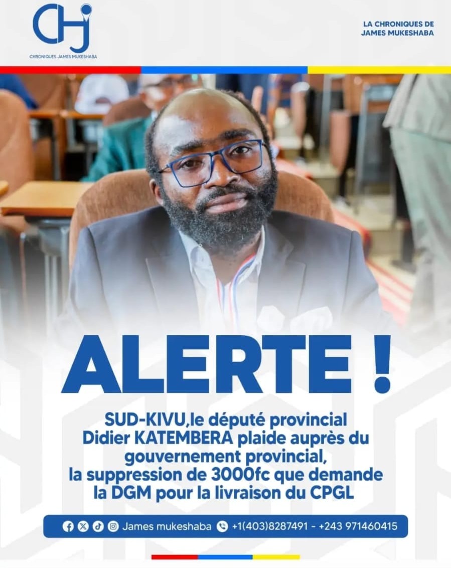 Le député provincial Didier Katembera s’est fait le porte-parole d’une frustration grandissante au Sud-Kivu, demandant au gouvernement la suppression du paiement du CPGL qui s’élève à 3000fc. Cette taxe, perçue par la population comme un fardeau supplémentaire, est au cœur d’un débat qui divise les opinions.